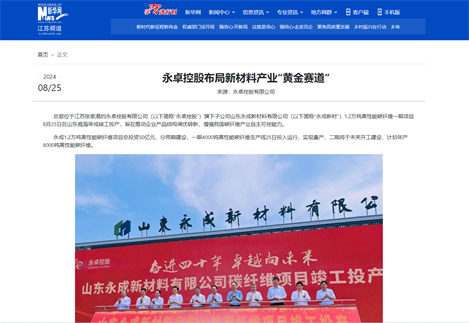 總部位于江蘇張家港的永卓控股有限公司(以下簡稱“永卓控股”)旗下子公司山東永成新材料有限公司(以下簡稱“永成新材”)1.2萬噸高性能碳纖維一期項目8月25日在山東威海榮成竣工投產,旨在推動企業產品結構調優轉新、增強我國碳纖維產業自主可控能力。永成1.2萬噸高性能碳纖維項目總投資50億元,分兩期建設,一期4000噸高性能碳纖維生產線25日投入運行、實現量產,二期將于未來開工建設,計劃年產8000噸高性能碳纖維。碳纖維具有細如發絲、強如鋼鐵、輕如鴻毛等性能優勢,是航空航天、電力、交通運輸等高端裝備、重大基礎工程領域的重要支撐性材料,素有“黑色黃金”的美譽。永卓控股總裁吳毅在致辭中表示,布局碳纖維“黃金賽道”,既是企業推動產業結構調優轉新、加快培育新質生產力的務實之舉,也是企業服務地方發展大局、提升創新活力的有益探索,更是企業融入國家戰略、增強我國碳纖維產業自主可控能力的擔當作為。據了解,竣工投產首日,企業生產的T700、T800、T1000級別高性能碳纖維產品一經亮相,便引發業界關注。“這些高性能碳纖維產品具有良好的拉伸強度,也就是通常所說的韌性。”永成新材總經理陳國祥說,以T800級別產品為例,其由1.2萬根7微米的細絲編成,僅相當于鉛筆粗細,卻能承載60噸拉力、經受住3000攝氏度高溫。為強化技術創新,永成新材組建起一支人均擁有20年碳纖維生產、研發經驗的科研團隊開展技術攻關,并投資7000多萬元建設三個檢驗室,配置檢測設備190臺(套),具備186項檢測能力。作為以鋼鐵起家的民營企業,永卓控股近年來加速推動鋼鐵主業向高端化、智能化、綠色化轉型,探索布局戰略性新興產業,逐步發展成為一個多元化、專業化的綜合性企業集團,2023年實現營業收入1608億元,躋身中國民營企業500強第81位。